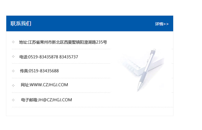 傳真:0519-83435688    郵編:213135    網址:WWW.czjhgj_com.zhjili.com    電子郵箱:JH@czjhgj_com.zhjili.com